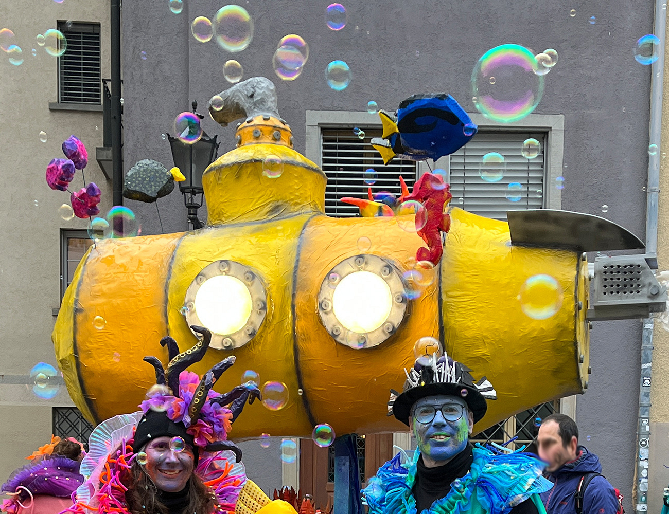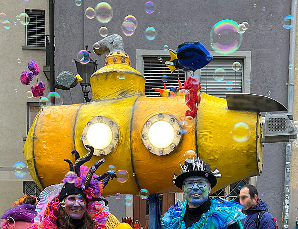 Diese Tage verstauen wir unsere Fasnachtsausrüstung wieder im Keller. Die Schminksachen sind gereinigt, die Kostüme zur allfälligen Wiederverwendung gelagert und der Wagen abgebaut. Der obere Teil unseres Wagens steht übrigens im Schulhaus Daleu. Es freut uns sehr, dass der Kindergarten dem gebastelten U-Boot ein langes Dasein ermöglicht.